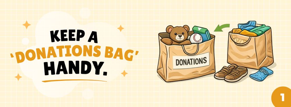 It's as simple as it sounds, but it’s a small habit that helps alleviate the pressure of having a full decluttering session: keeping a ‘donations bag’ accessible at all times. It can be a small bag, a decorative basket, or even a box reserved for items you want to donate. As soon as you notice items you no longer use or enjoy, place them directly into the bag.